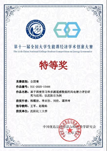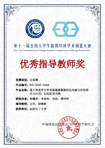 第十一届全国大学生能源经济学术创意大赛总决赛在5 月 24 日至 25 日举行。我校研究生韩耀鹏等学生的作品《基于深度学习和多源遥感数据的风电潜力评估研究与应用:以沈阳市为例》成功进入终审决赛,在激烈角逐中最终斩获全国研究生组特等奖。该作品由我校Beat365官方网站王军教授和中国科学院青岛生物能源与过程研究所田亚峻研究团队的赵敬皓工程师联合指导,是我校在该大赛中取得的历史最高奖项。