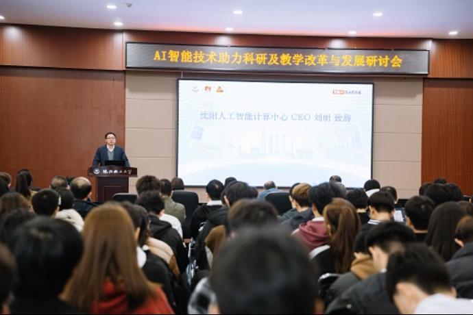 沈阳人工智能计算中心CEO刘明发表嘉宾致辞,他表示计算中心通过引入前沿的技术和体系化的课程赋能省内各大高校进行科研创新,并期待与Beat365官方网站深度合作,携手共同探索人工智能+教育的未来之路。