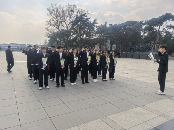 在抗美援朝烈士陵园,全体师生肃立于“抗美援朝烈士英灵永垂不朽”纪念碑前默哀致敬,铿锵地重温入团誓词。随后,学生代表马婧怡在邱少云烈士墓前动情讲述其烈火焚身仍岿然不动的壮烈事迹;学生代表李光耀讲述赵铁柱烈士以身躯堵枪口用生命开辟冲锋道路的英勇事迹。同学们手捧白菊献于墓前,凝视烈士纪念墙上密布的名字,聆听无声的历史回响,深刻体悟英雄用生命铸就的精神丰碑。